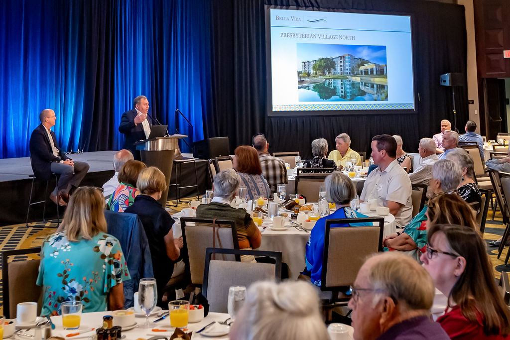 Tim Mallad, FL CEO, offered an overview of the organization’s values and operational philosophy, emphasizing the commitment to enriching the lives of seniors. Photos of sister communities, Presbyterian Village North in Dallas and The Outlook at Windhaven in Plano, were shared, showcasing the high standard of living residents can look forward to at BV.