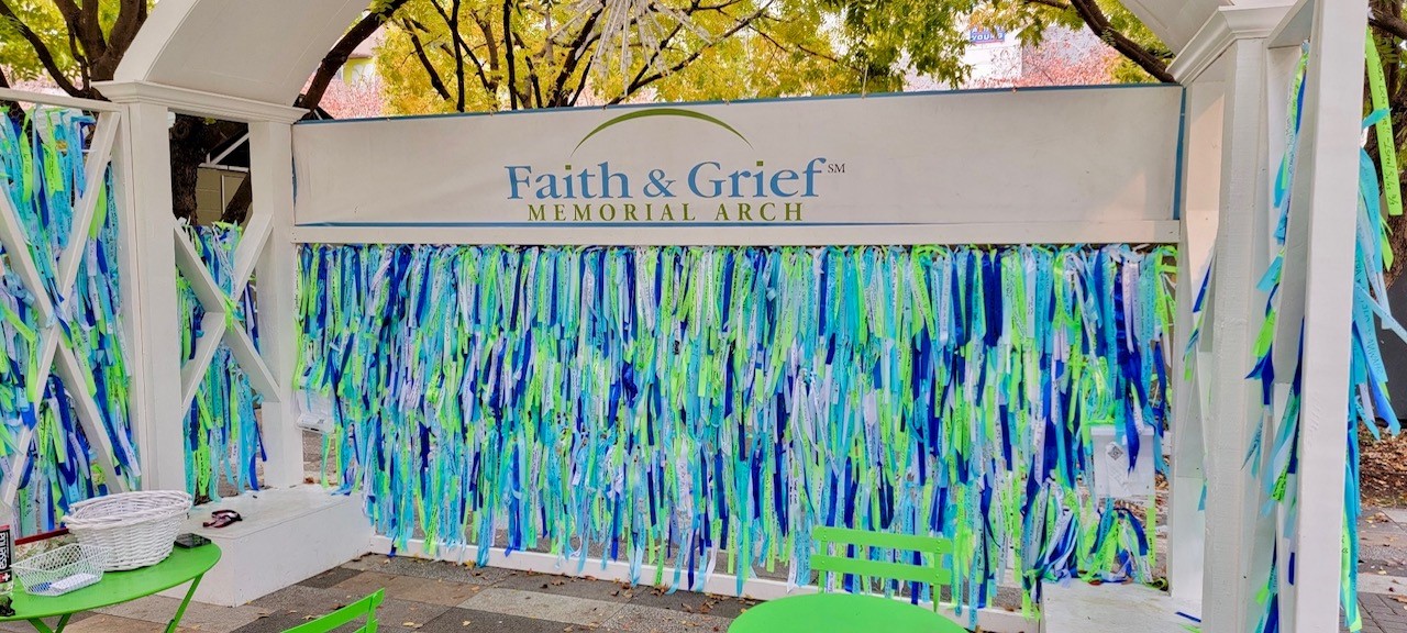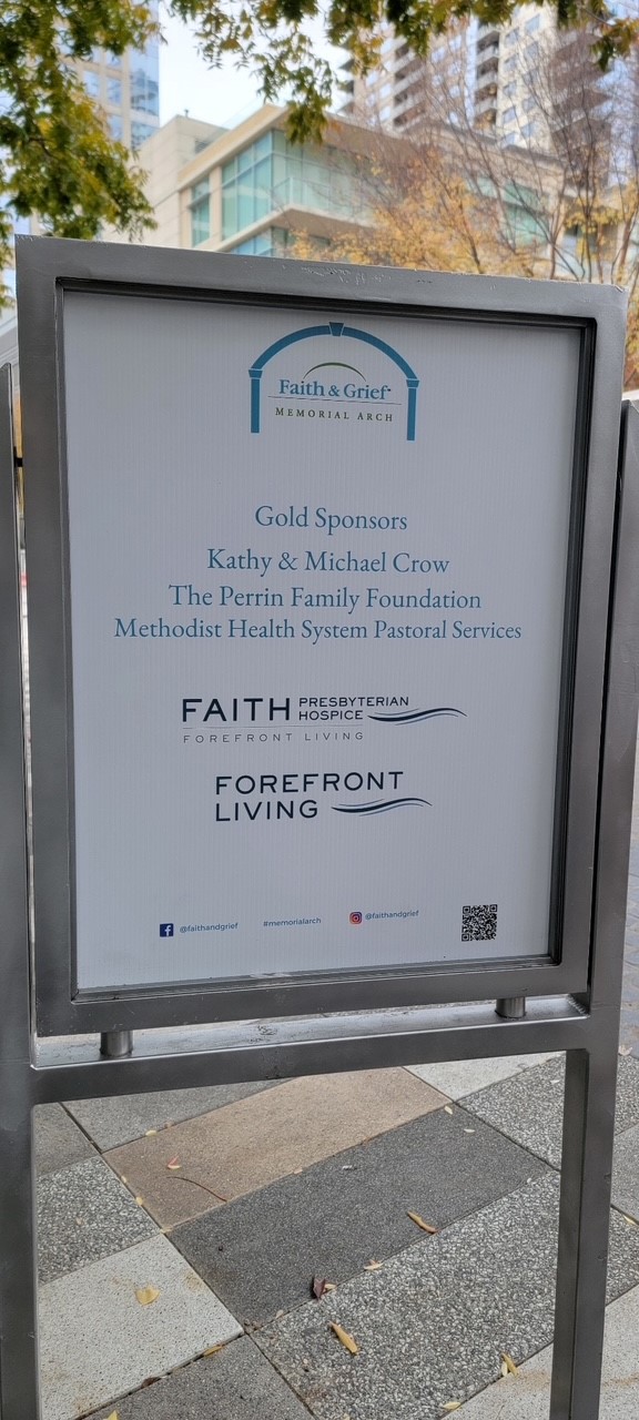 Forefront Living and Faith Presbyterian Hospice are proud sponsors of the 9th Annual Faith & Grief Memorial Arch at Klyde Warren Park in Dallas from Nov. 22 – Dec. 15. The Arch is a place of hope and comfort where everyone is invited to honor their loved ones by writing their names on ribbons and tying them to the Arch as a symbol of remembrance. This December, Forefront Living Foundation teammates volunteered at the Arch, distributing ribbons to those wishing to honor a lost loved one.
