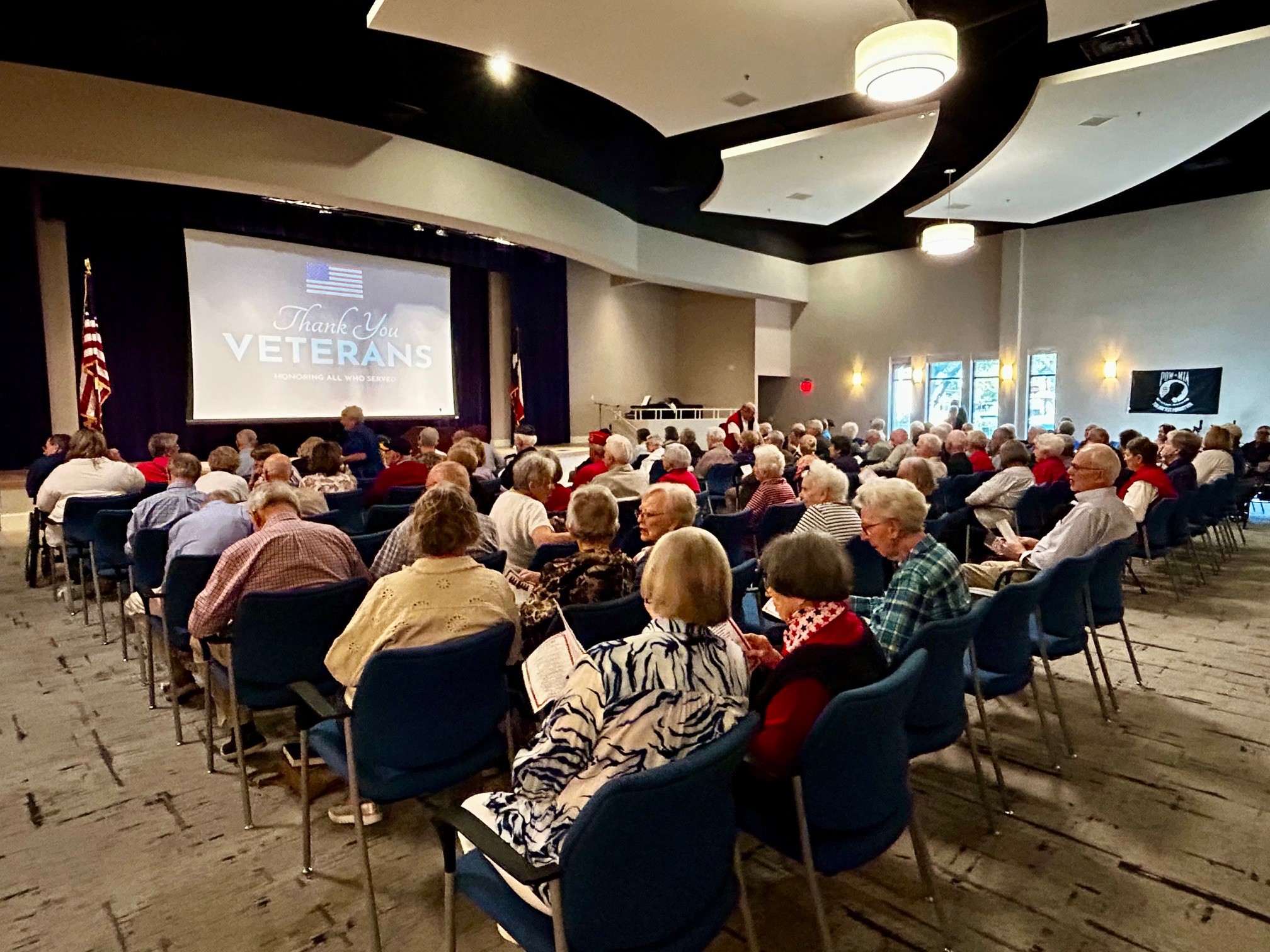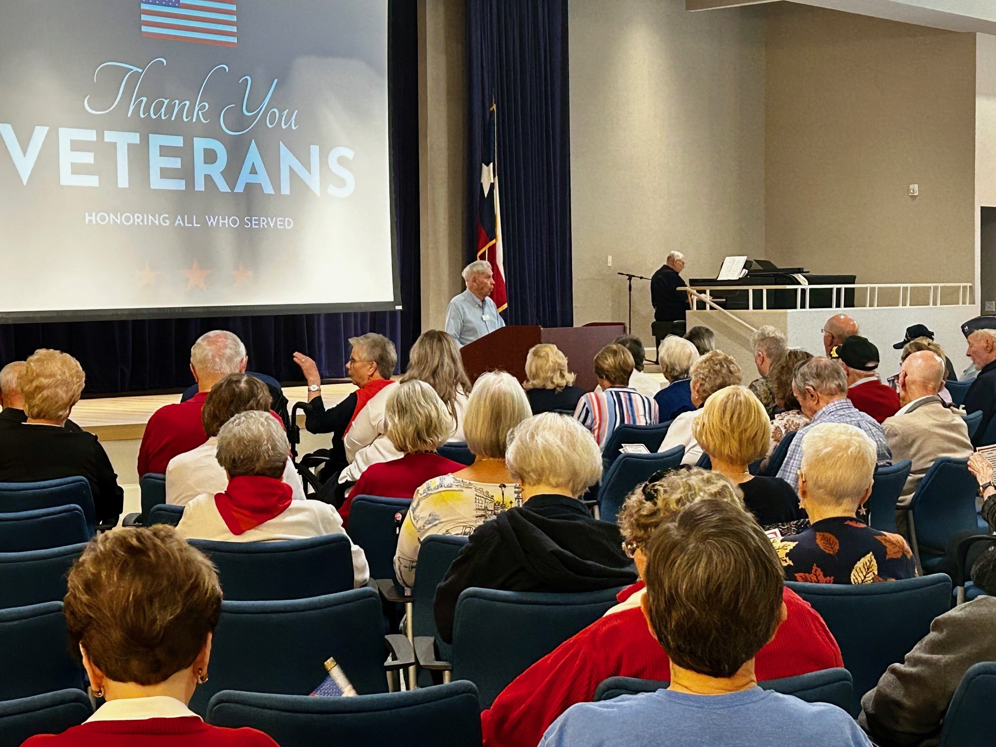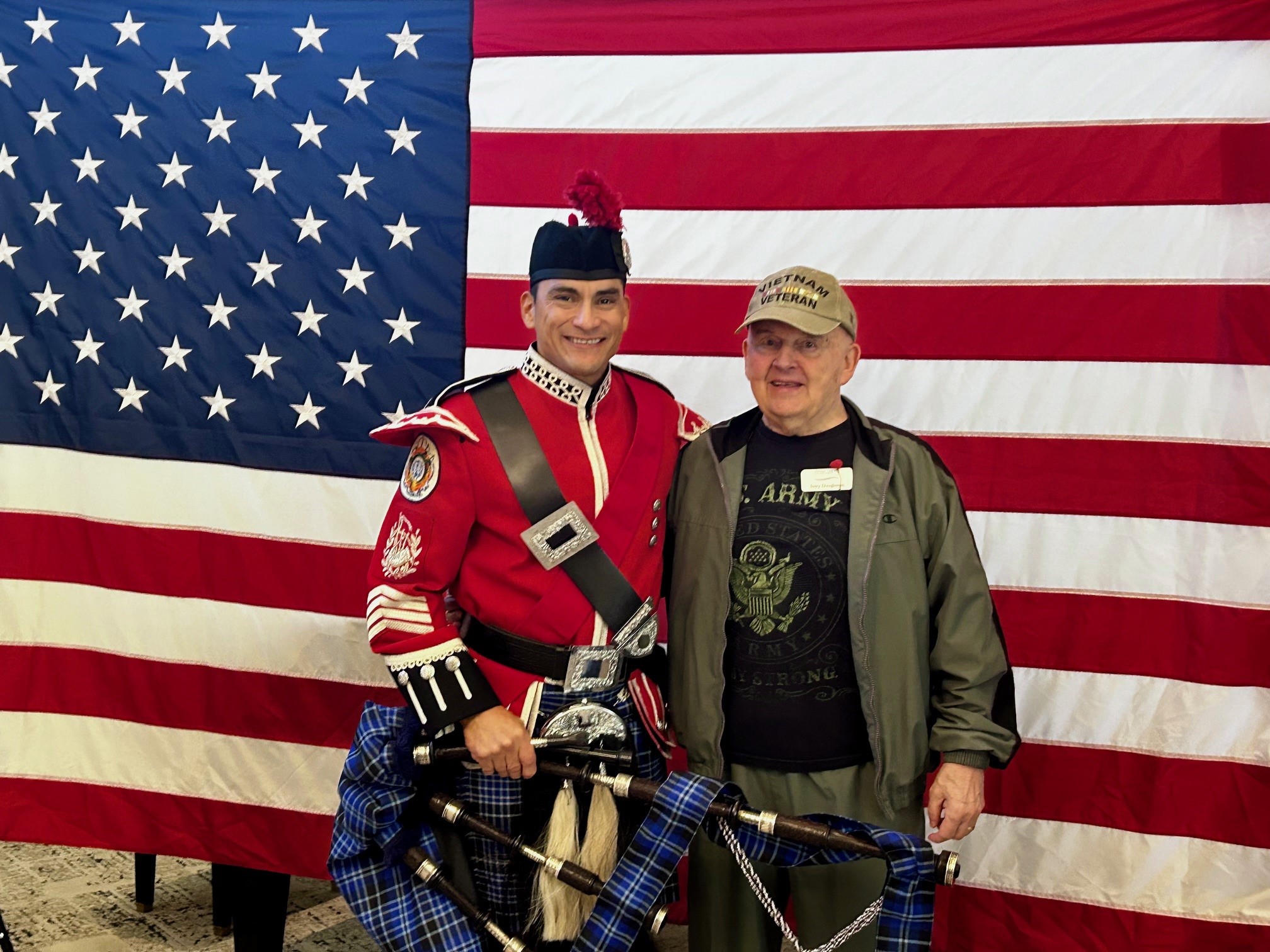 Presbyterian Village North hosted a special program in McGowan Auditorium, where resident veterans played key roles in leading the Pledge of Allegiance, delivering the invocation, sharing words of remembrance and guiding the crowd in singing “God Bless America.” The program also featured a moving bagpipe performance by Jim Royer, a Dallas Fire Department Captain.